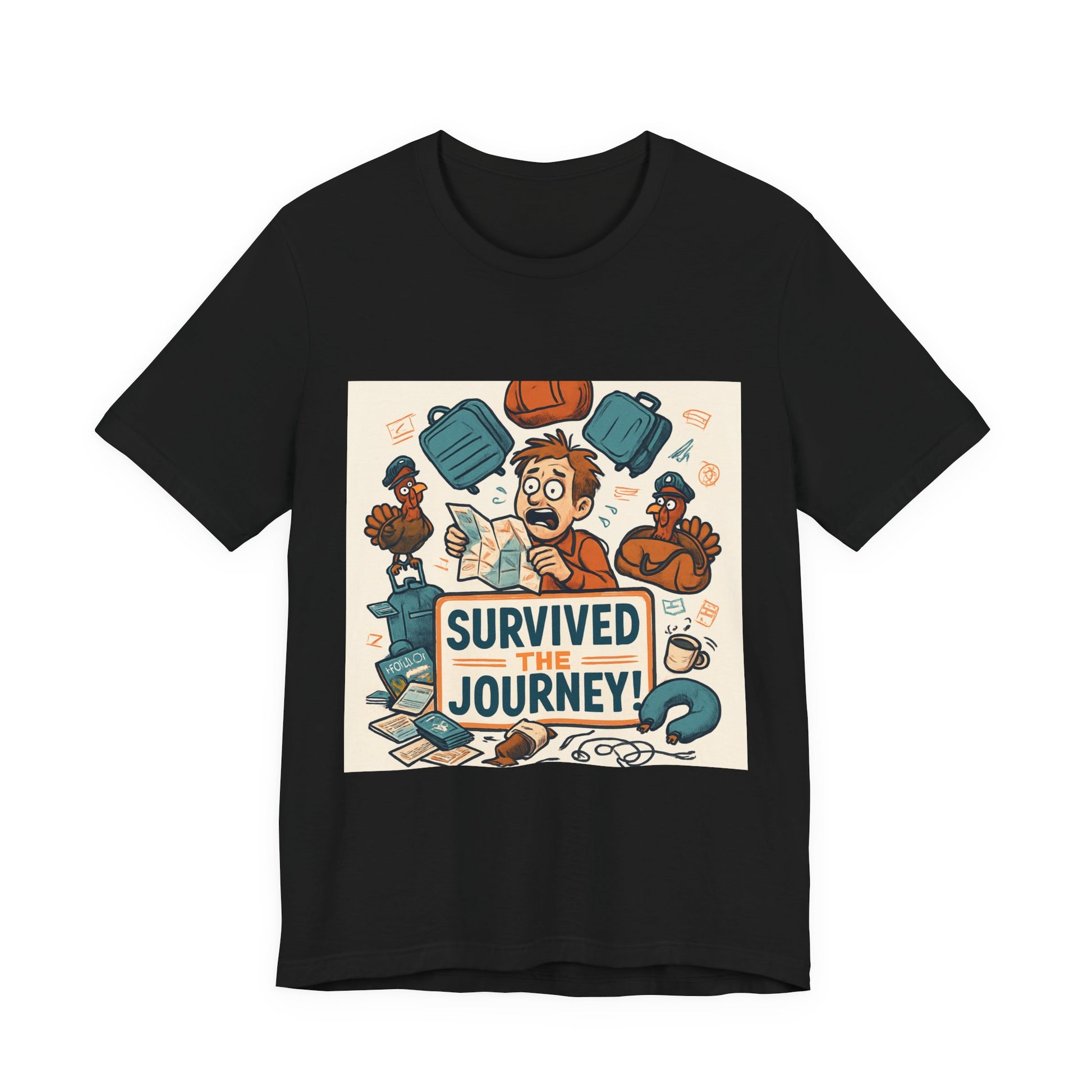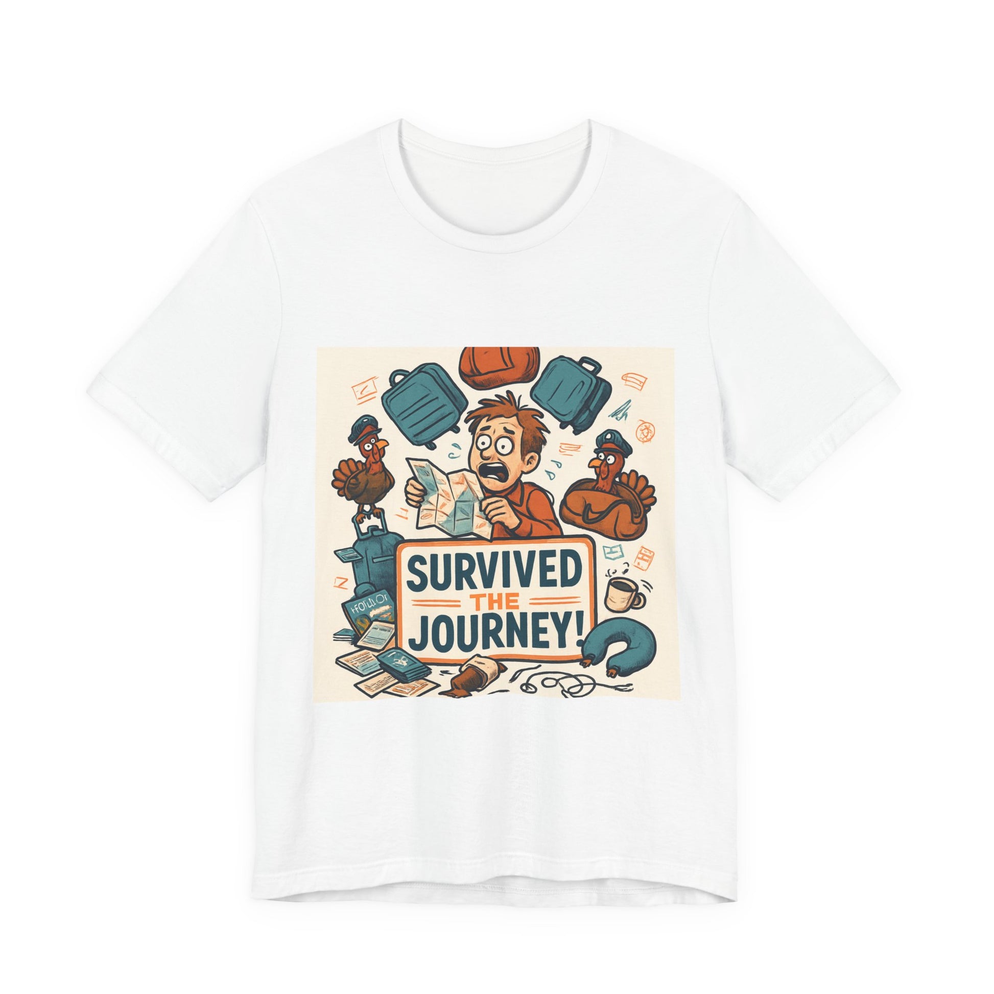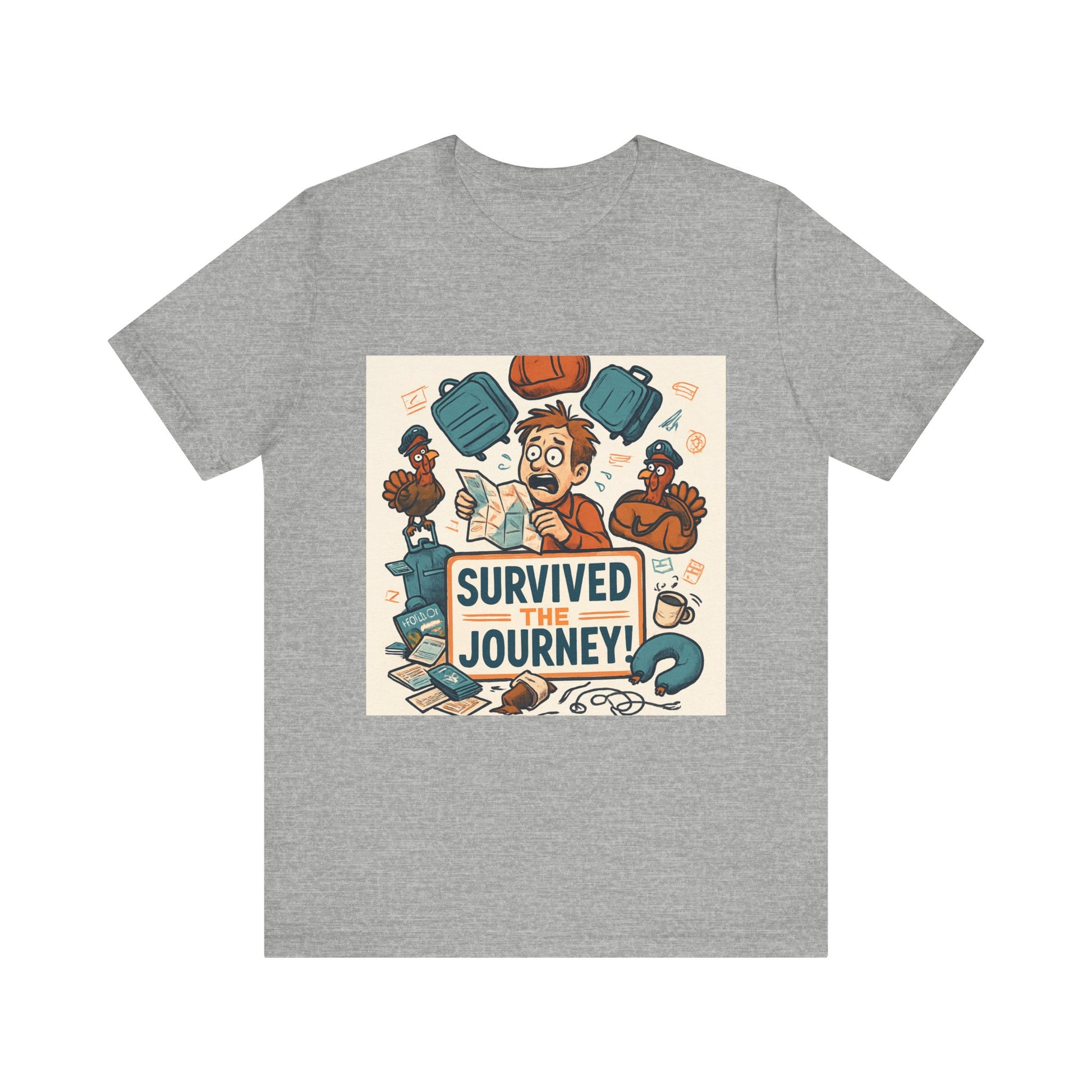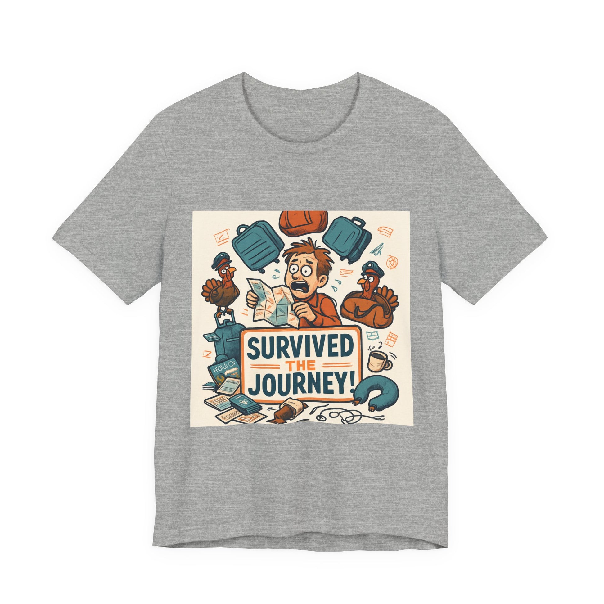 Lightweight, breathable, and softly structured — this tee wears like the end of a long trip when you finally collapse into clean sheets. The front shows a cheeky, hand-illustrated scene of a wide-eyed traveler amid scattered luggage and travel odds-and-ends, with the bold caption “Survived the Journey!” It reads like a traveler's badge of honor: worn by people who laugh about missed connections, suitcase mishaps, and the small, messy victories that make a trip memorable. The crew neckline and retail fit keep the silhouette clean for layering under a jacket or pairing with well-loved jeans. Made from Airlume combed and ring-spun cotton, it feels soft against the skin and breathes on warm days, while side seams and shoulder tape help it keep its shape after many washes. REACH certified and responsibly manufactured, it’s a thoughtful choice for anyone who collects stories more than souvenirs.
